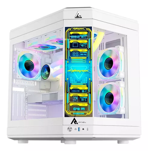 O Ryvel Cube Screen White é uma opção diferenciada para quem busca design moderno e funcionalidade premium. Ele conta com uma tela IPS integrada personalizável entre o painel lateral e frontal, que pode exibir imagens ou informações do sistema.