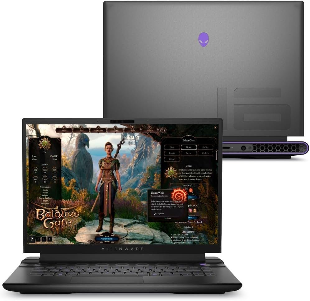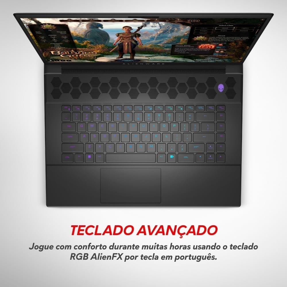 Abrindo nossa lista com nada mais nada menos que o Dell Alienware m16 AW16, um dos mais fortes nomes quando pensamos no melhor notebook para programar. O primeiro ponto que chama atenção aqui é a RAM de 32 GB e o processador Intel Core i9. Essas configurações mostram que a máquina conta com uma potência perfeita para para lidar com as demandas mais intensas de desenvolvimento de software.